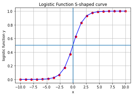 - A logistic function (sigmoid function) is an S-shaped curve, with real number inputs between (-∞, +∞) and output probability between (0,1)