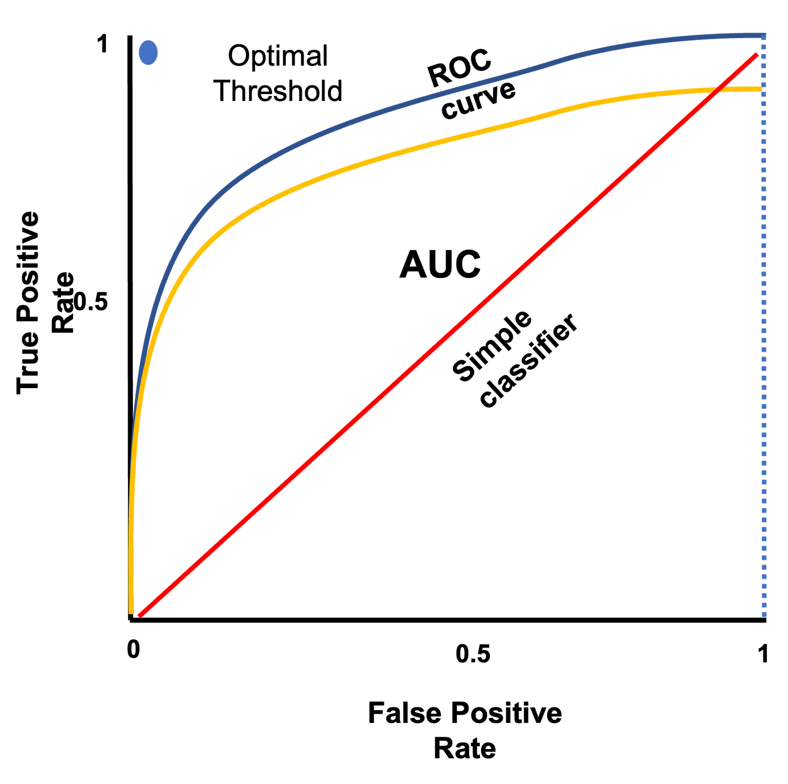 - The top left corner of the plot is the ‘optimal threshold’ where TPR = 1 and FPR = 0