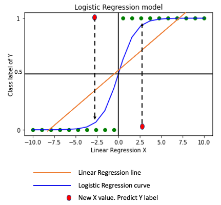 - We can now predict the class label for new X values depending on where they fall on the best fit logistic model curve